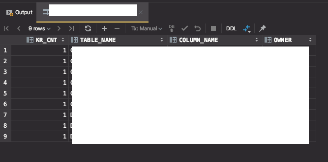 EXECUTE IMMEDIATE 'INSERT INTO TB_SHOW_KR_COLUMN(KR_CNT, TABLE_NAME, COLUMN_NAME, OWNER) ' || 'SELECT A.KR_CNT, A.TABLE_NAME, A.COLUMN_NAME, A.OWNER FROM (SELECT COUNT(*) AS KR_CNT, '''||VAR.TABLE_NAME||''' AS TABLE_NAME, '''||VAR.COLUMN_NAME||''' AS COLUMN_NAME, '''||VAR.OWNER||''' AS OWNER FROM '||VAR.TABLE_NAME||' WHERE REGEXP_LIKE('||VAR.COLUMN_NAME||', ''[가-힝]'') AND ROWNUM = 1) A WHERE A.KR_CNT > 0';